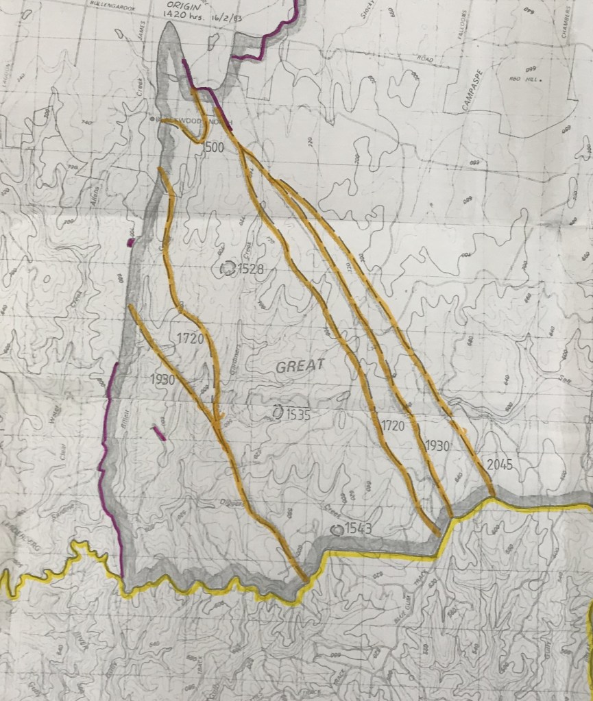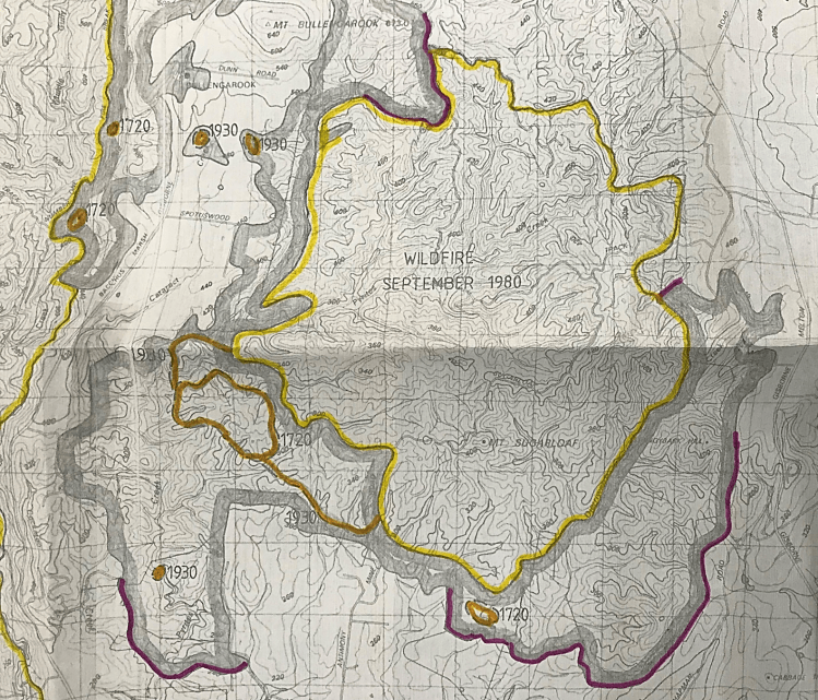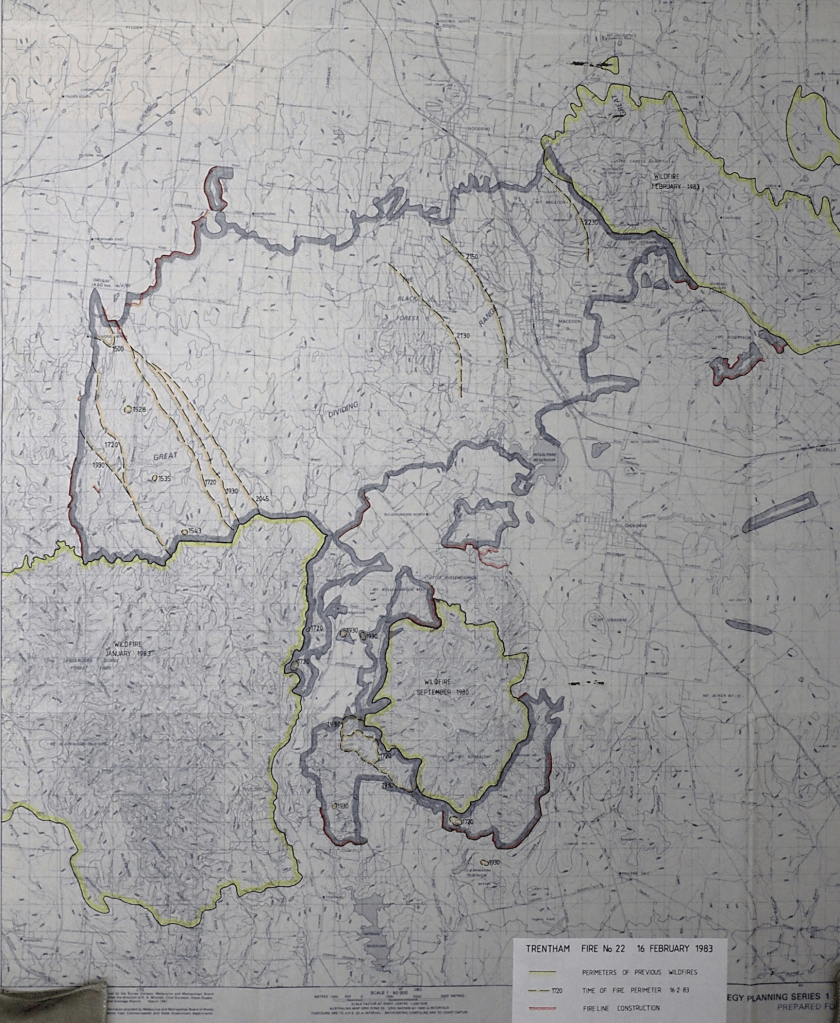 A large fire south of Trentham at Pyrete in September 1980, together with the recent Greendale fire a few weeks earlier on 8 January 1983 fortunately slowed the southerly run of the head fire.