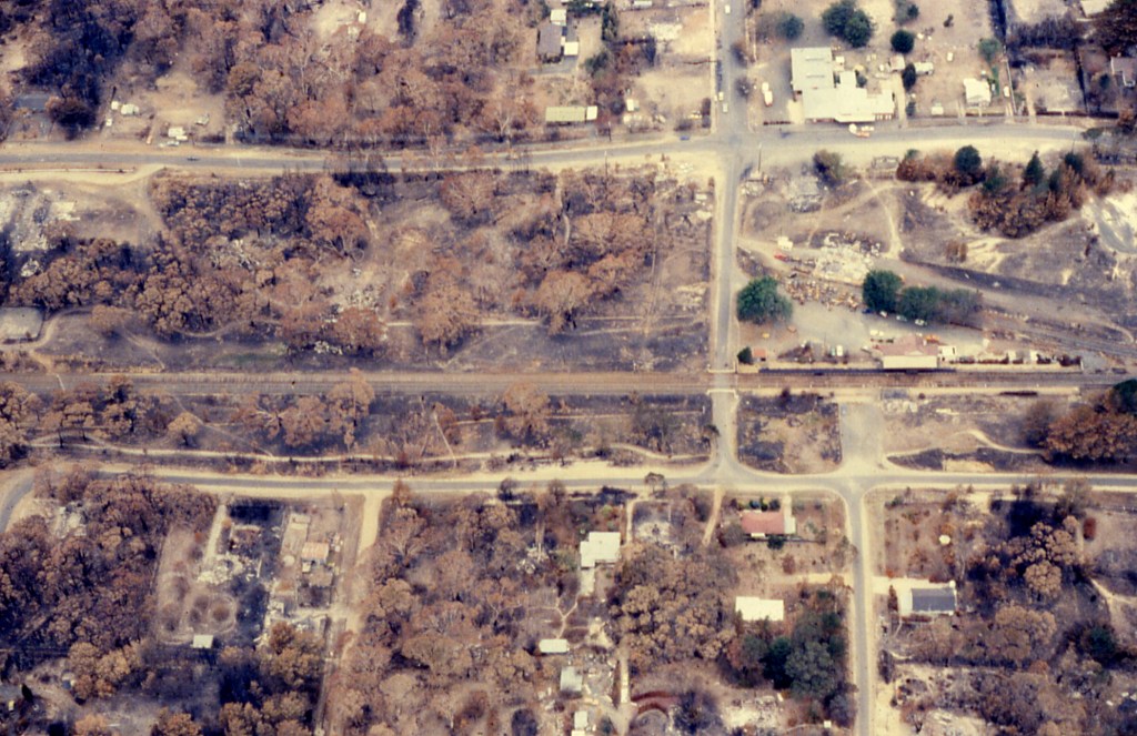 Before the wind change about 20% of the forest was burnt by crown fire but following the change on the evening of Ash Wednesday this increased to about 80%. Ground fuels and vegetation in the forest were completely obliterated, although the pattern was patchy in the grassland and grazed paddocks where there wasn’t much fuel.