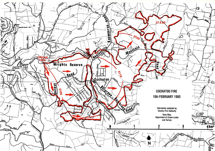 The Cockatoo fire began late afternoon at 7.28 pm on Ash Wednesday 16 February 1983, about four hours after the blaze at Belgrave South. It was reported to the Forests Commission Victoria (FCV) office at Kallista by Jon Gwilt in the Briarty’s Hill firetower who could see smoke south of Macclesfield.