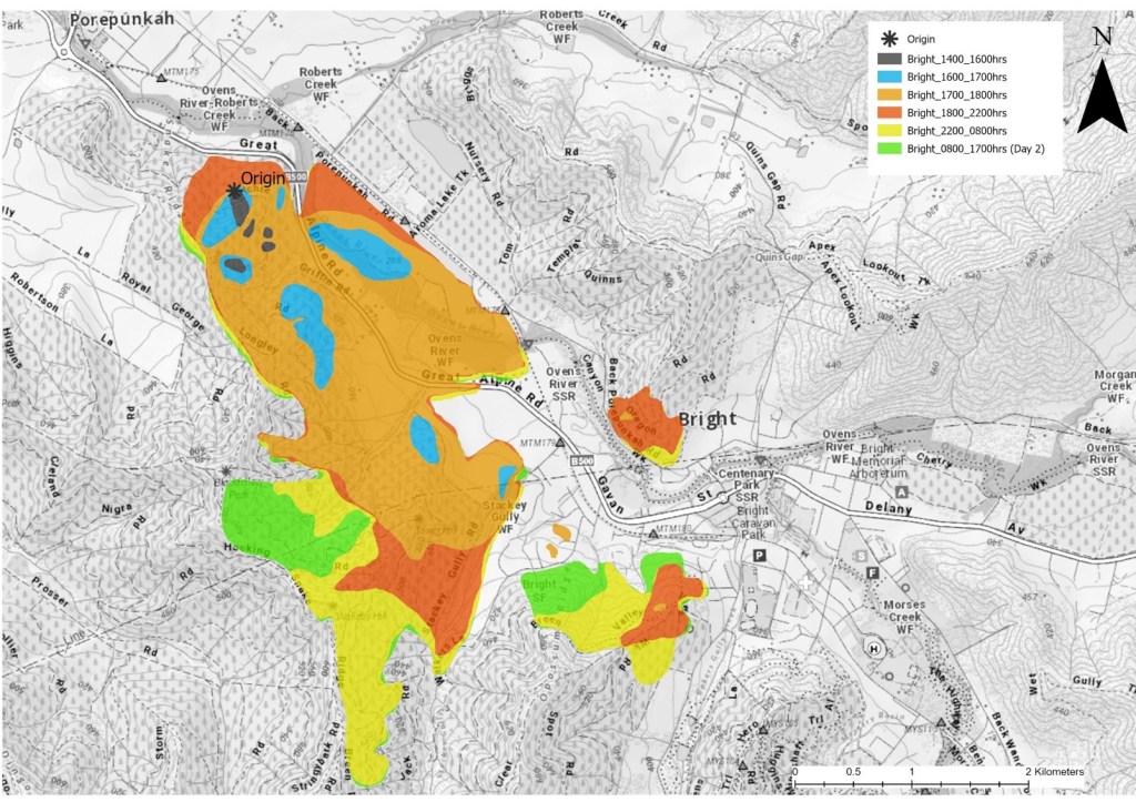 Progression of the Bright plantation fire – November 1982. Map produced by Owen Salkin 2022. Based on FCV Fire Research Report No. 19 (1983). Neil Watson, Gary Morgan and Derrick Rolland.