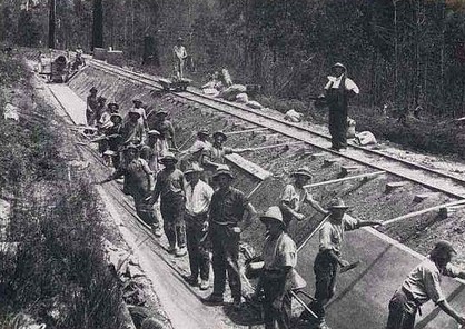 Next to the cement lined channel, a flat access track was constructed from the excavated material with a rail line on top to deliver heavy construction materials like timber, stone, pipes, steel and cement.