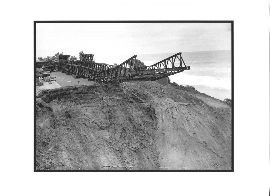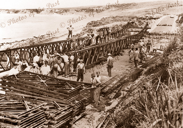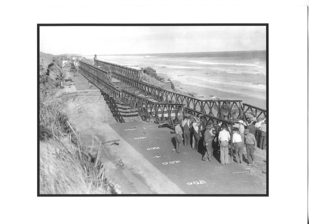 The Country Roads Board (CRB) mobilised the Army Reserve’s 22 Construction Regiment from Melbourne to help erect a single lane Bailey Bridge across the gaps.