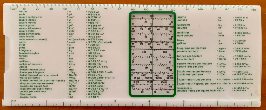 The Forest Metriverter slide-rule was issued by the Forestry and Timber Bureau to make metric conversions easier.