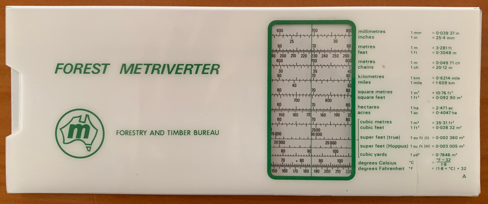 The Forest Metriverter slide-rule was issued by the Forestry and Timber Bureau to make metric conversions easier.