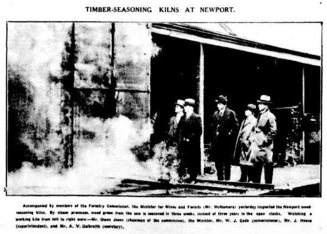 Accompanied by members of the Forestry Commission, the Minister for Mines and Forests (Mr. McNamara) yesterday Inspected the Newport wood-seasoning kilns. By steam processes, wood green from the saw is seasoned in three weeks, Instead of three years in the open stacks. Watching a working kiln from left to right were:-Mr. Owen Jones (chairman of the commission), the Minister, Mr. W. J. Code (commissioner), Mr. J. Hausa (superintendent), and Mr. A.V. Galbraith (secretary). Argus, 7 August 1924.