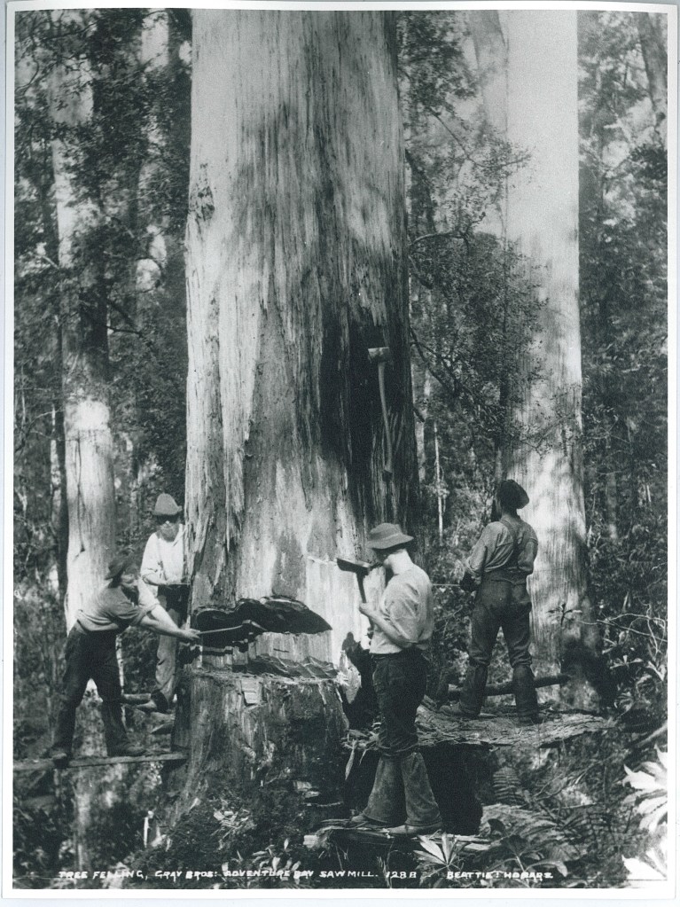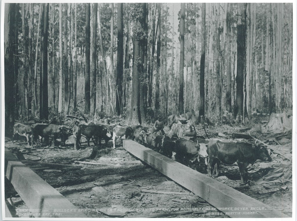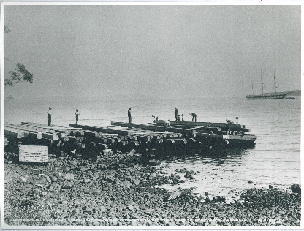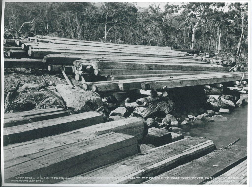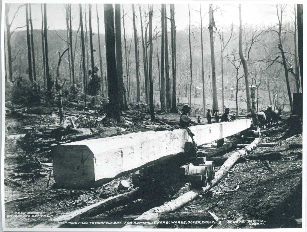 These photographs, taken in the early 1900s, are of 100 foot long Blue Gum (Eucalyptus globulus) piles produced by the Gray Brothers mills on Bruny Island in southern Tasmania.