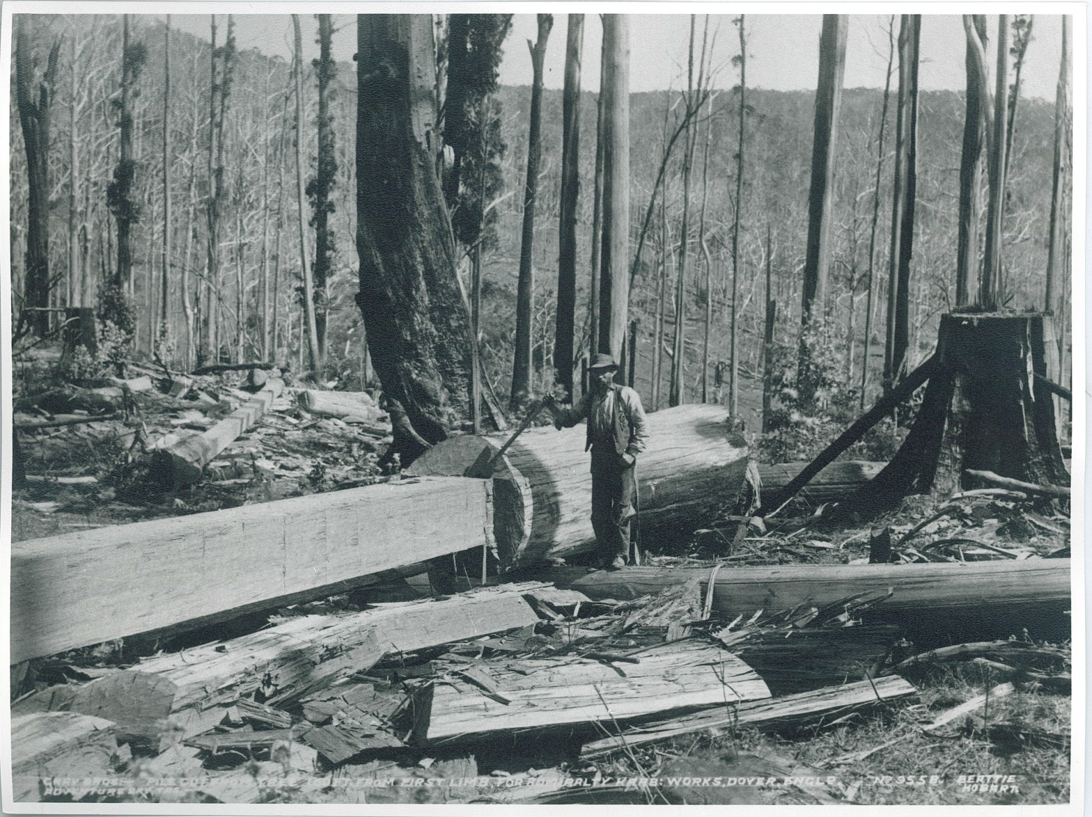 These photographs, taken in the early 1900s, are of 100 foot long Blue Gum (Eucalyptus globulus) piles produced by the Gray Brothers mills on Bruny Island in southern Tasmania.
