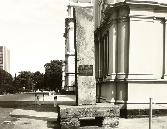 this pillar of stone quarried from Stawell was placed here on the insistence of the Hon. John Woods, M.P. to express his indignation of the choice of New South Wales stone for Parliament House and to show the enduring qualities of local stone.
