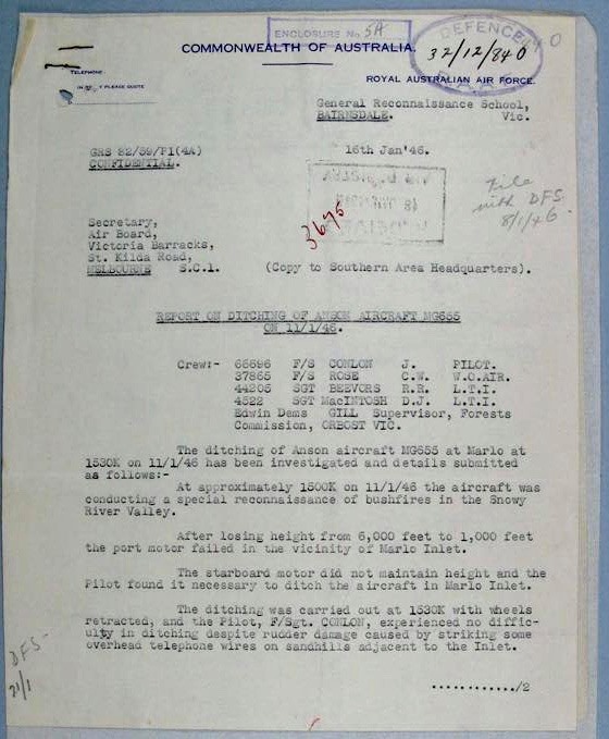 But on the return trip Anson MG655 collided with some overhead wires at Marlo and crashed into the Snowy River.
