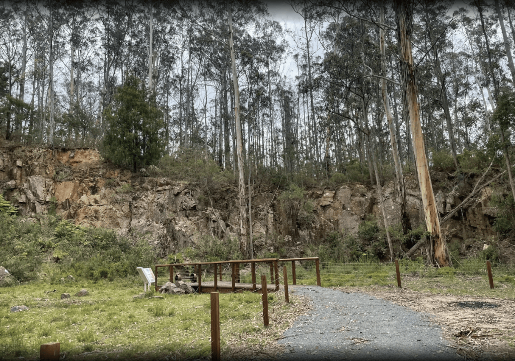 Most of the old wooden bridges on the tramway had collapsed and needed to be replaced. Remnants of steel rail line and lumps of stone can be found along the track. New signs and a viewing platform at the quarry were built while some old tramway wheels were salvaged for display and a piece of polished granite is included in the design.