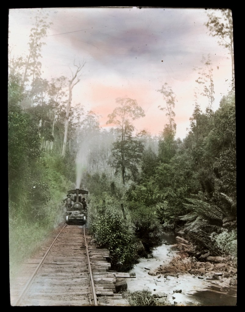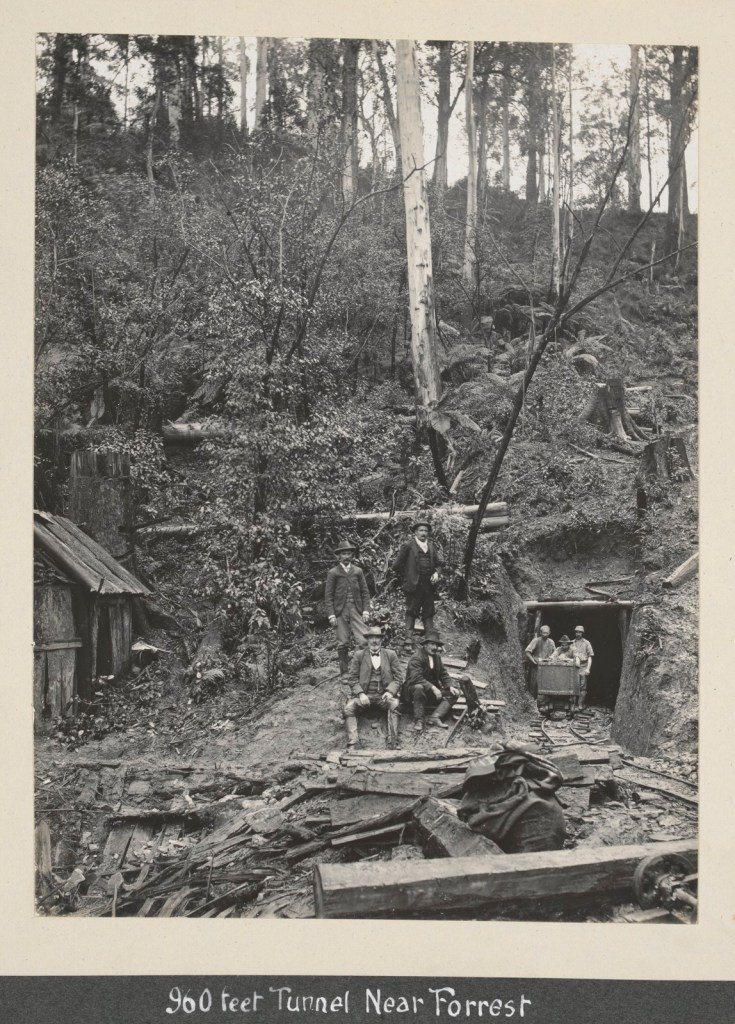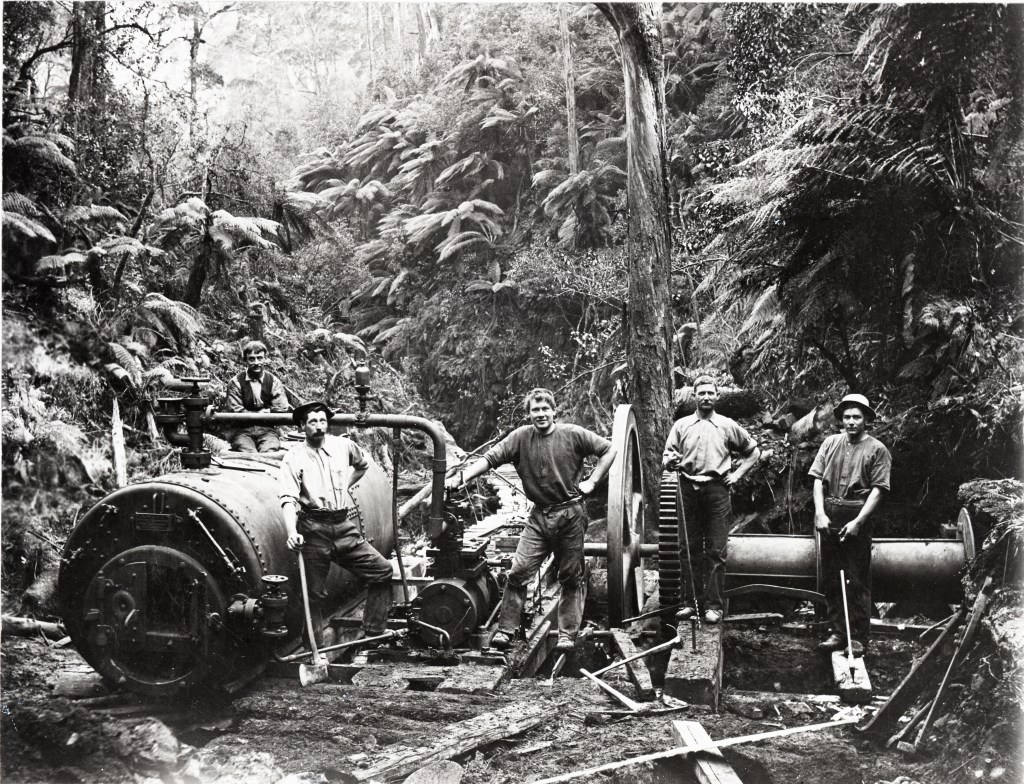 Henry’s No. 1 Mill was established in 1904 deep in the watershed of the West Barwon River. It was one of the largest sawmills in the area and could cut as much as 23 m3 per day. It was connected by a narrow-gauge timber tramline to the railhead at Forrest, ten kilometres to the north. The line included about 57 timber bridges and an impressive 960 foot tunnel at Noonday creek. Several steam engines rode the tracks, the first one in 1911 was known as Tom Thumb.