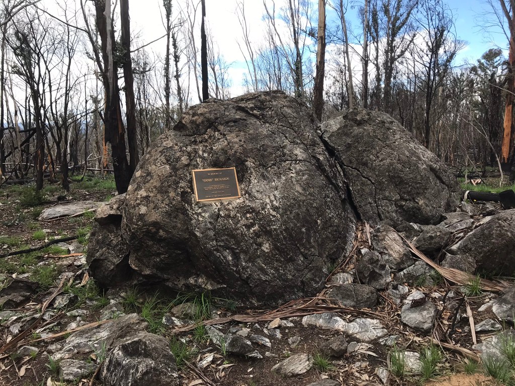 A metal plaque was later placed on a nearby rock by the side of the Alpine Way between Cobungra and Mt Hotham.