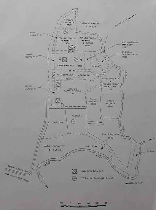 It was established as a research plot to examine interception of rainfall by tree canopies and for comparison with native mountain ash forest in the Coranderrk area. There are over 1476 trees ranging in height from 20 metres to the tallest being 55 metres on an even 3.3 m grid spacing. The stand has not self-thinned like the one in the Otways and is not as tall.