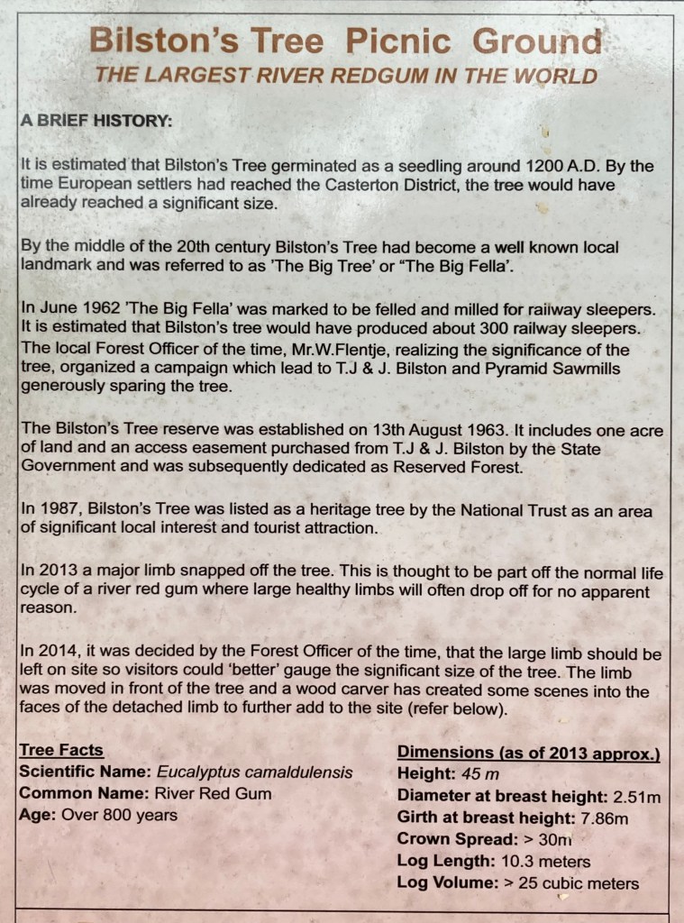 A sign on the Casterton-Chetwynd Road makes the bold claim that the Bilston Tree is the world’s largest river red gum. Tourism websites and Google repeat the assertion.
