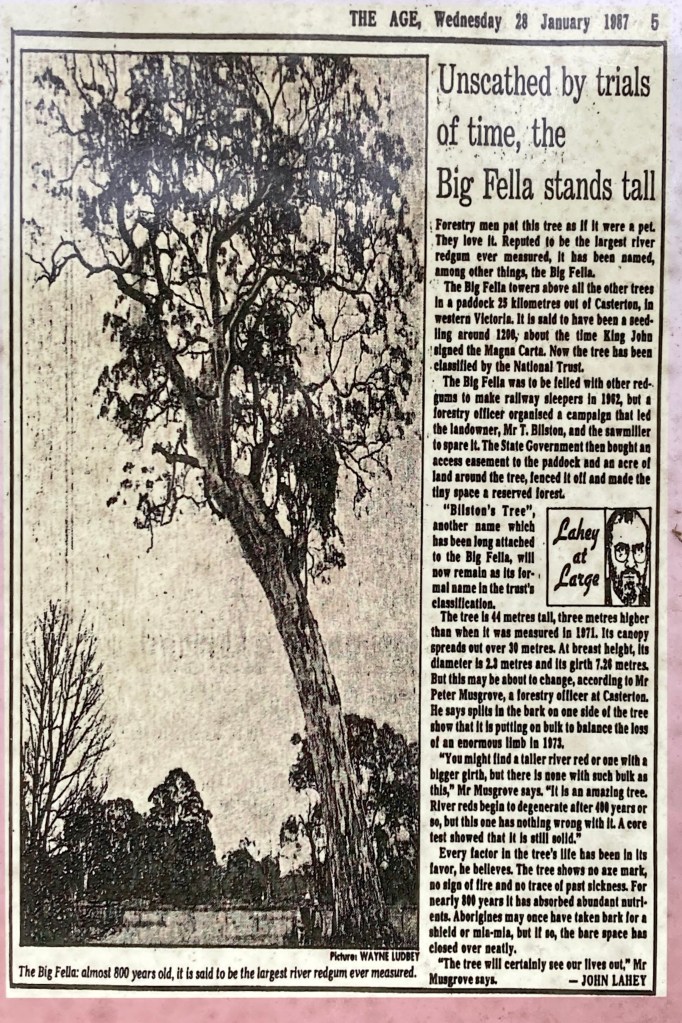 The local Forest Overseer, Peter Musgrove, reported in 1987 “you might find a taller river red, or one with a bigger girth, but there is none with such bulk as this”.
