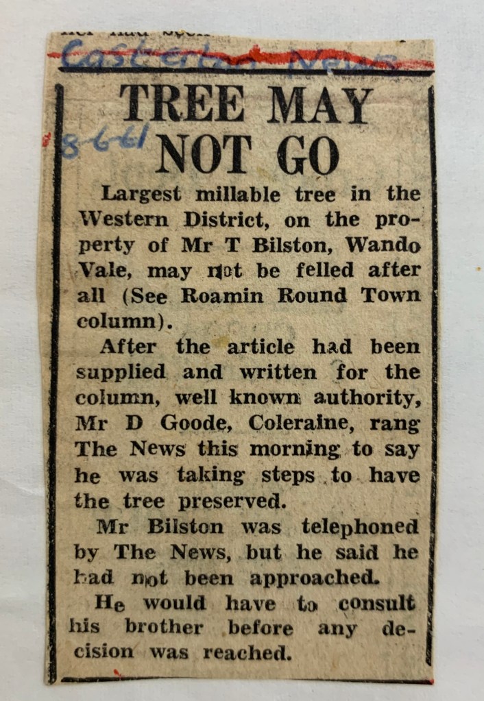 All the standing timber on three paddocks of the Bilston’s property was subsequently sold for a cash amount to Pyramid Sawmills at Casterton but the owner, Lance Thyer, could readily see the significance of the big tree to the local community and was instrumental in having it saved.