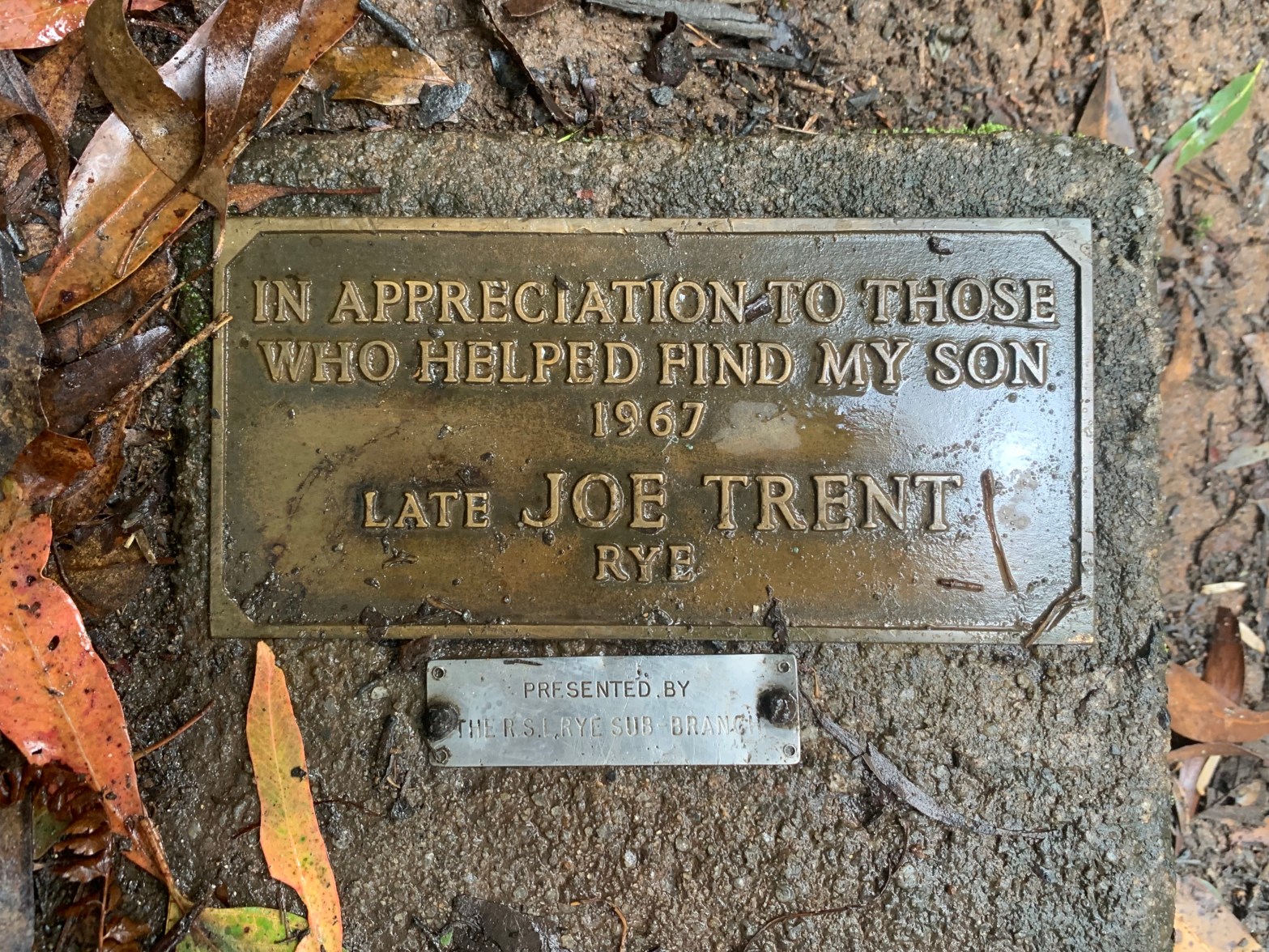 This small brass plaque to the late Joe Trent can be found at the base of Toorongo Falls near Noojee.