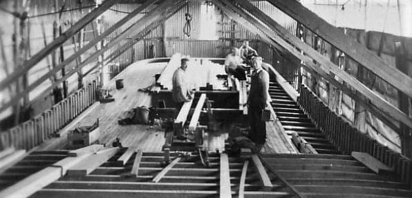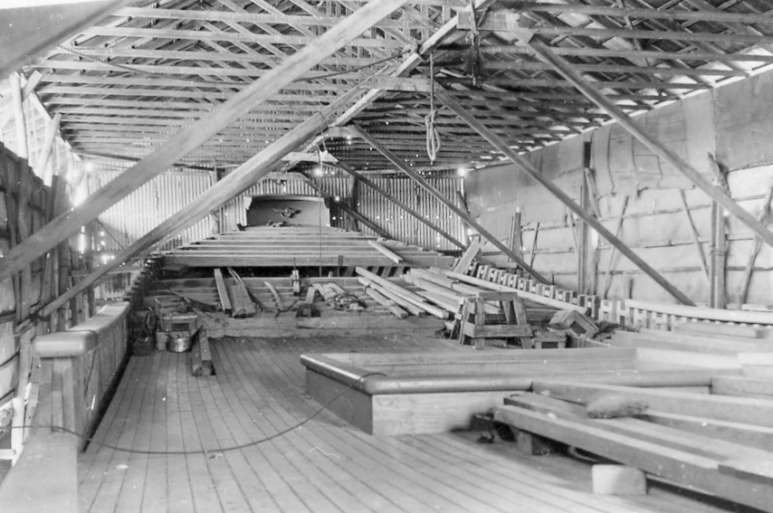 A scaffold covered with waterproof malthoid paper and canvas was erected to keep out the weather as the ship progressed. A long steaming tube was made to soften the timbers to bend them to the curve of the hull.