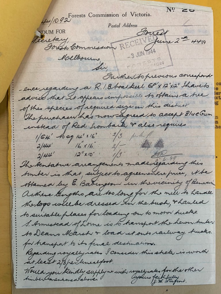 The District Forester advised that such a big red ironbark wasn’t available but a blue gum (E. globulus) meeting their specifications for the keel could be found.