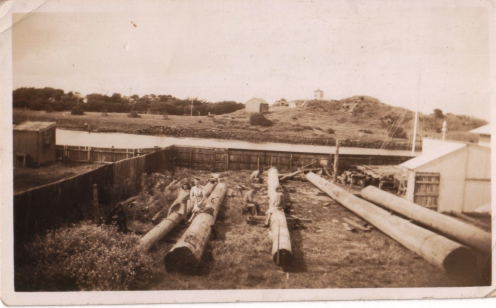 When the six logs finally arrived at Port Fairy on 8 September 1944 there were no cranes big enough to handle them, so the Haldane brothers constructed lifting frames with ropes and pulley blocks as well as timber jinkers to transport them.