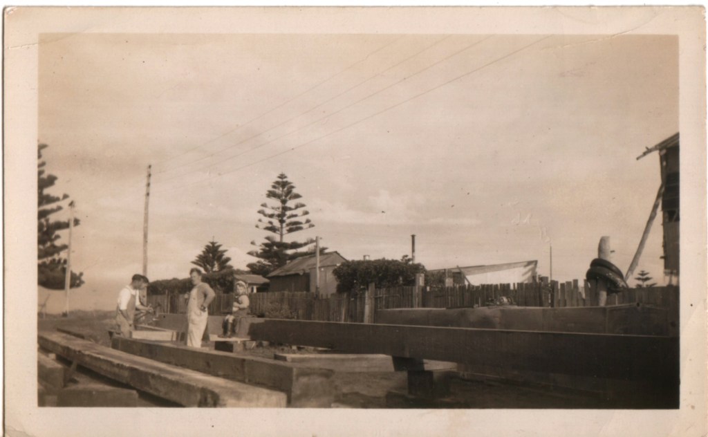 The brothers then man-handled the logs onto their vacant house block on the banks of the Moyne River, where the boat was to be built, and set about squaring and shaping them with an adze, a broad axe and a crosscut saw.