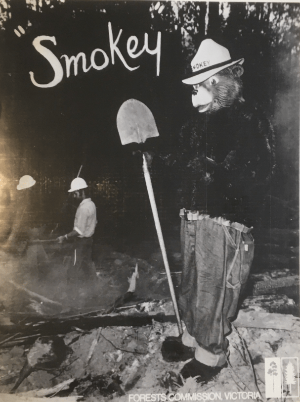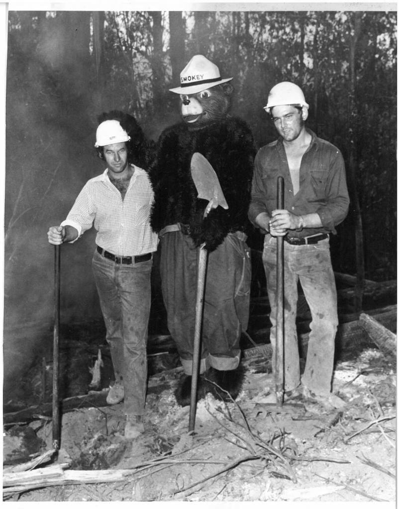 The Public Relations Officer called me in. The US Consulate just rang offering us Smokey Bear. We want to put him in Moomba. My reply probably reflected my interest in the protection of our national culture and my knowledge, as a gardener, that horse manure made excellent compost. But we need a human body to drape the suit around. How about you? I agreed. I knew that a few others would be silly enough to ley themselves in for such a task and I thought that seeing half a million Victorians through Smokey’s eyes would be interesting (for I presumed that he had ocular orifices).