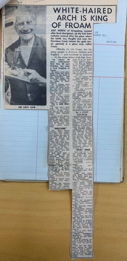 In November 1970, Archie wrote to the Forests Commission seeking access to an adjoining 2 acres of land to establish picnic and camping sites for scouts and guides. He also asked about a more permanent tenure arrangement such as a long-term lease, or even freehold title, rather than the annual licence. He attached a newspaper article from the Gippsland Times.