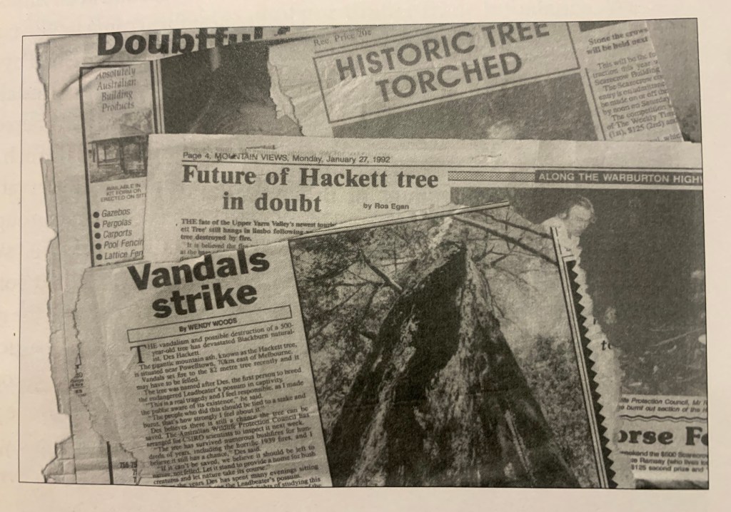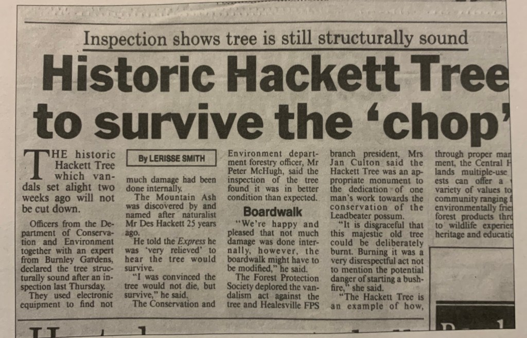 Not surprisingly, Peter Pruess was seething at the wilful damage, and without any discussion or warning he invited the media to the Hackett Tree on Monday 20 January 1992. I was contacted late on Sunday evening and dropped in the deep end.