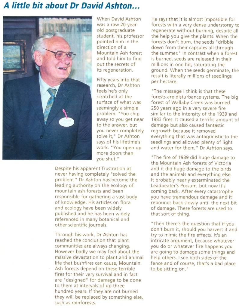 David was unquestionably the world expert on the ecology of mountain ash forests (Eucalyptus regnans).