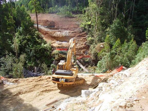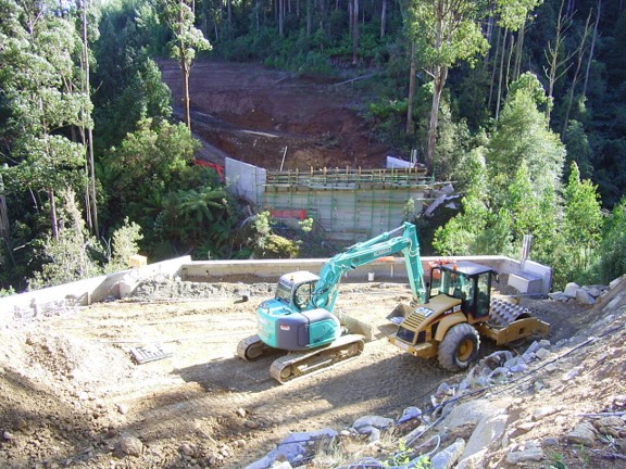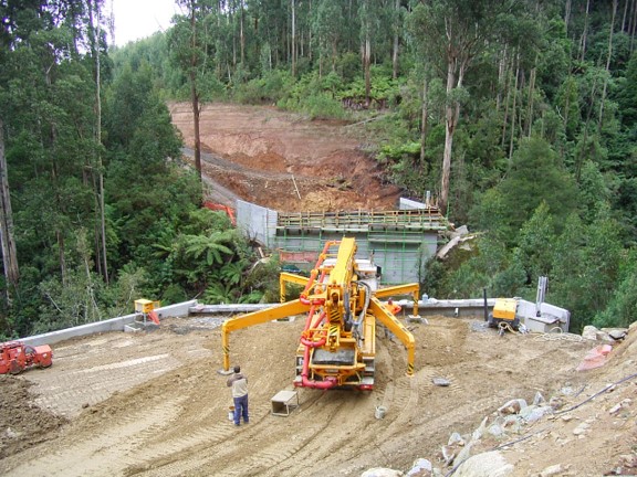 Major earth moving and side cuts were required because the road alignment ran across the side slope of the Baw Baw Ranges.