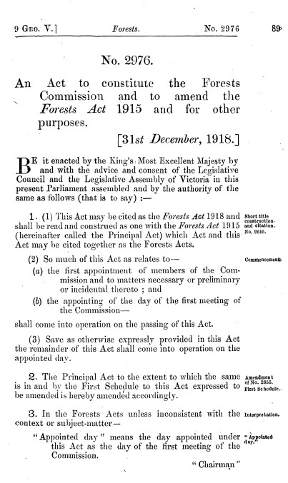 On the 31st of December 1918, just weeks after the end of WW1, a comprehensive amendment to the Forests Act (1915), number 2976, abolished the 1907 State Forest Department (SFD) and created the Forests Commission of Victoria (FCV) with three Commissioners to lead a new independent organisation