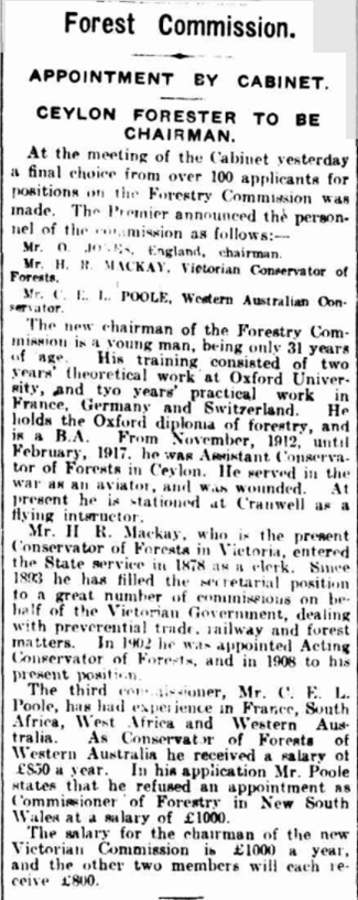 With an eye to career advancement, Jones chose not to return to Ceylon after the War and, at the age of 32, applied on 3 February 1919 for the Chairmanship of the newly formed three-person Forests Commission Victoria.