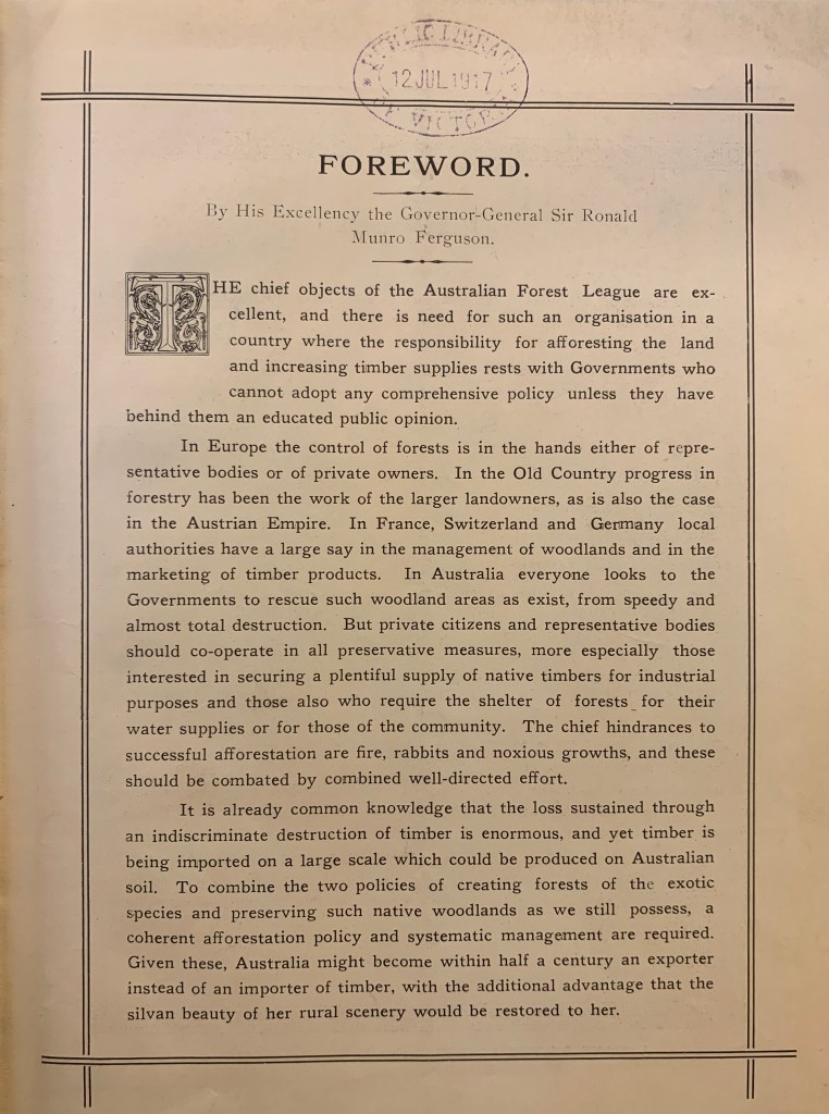 The League’s 1917 constitution called for “the advancement of educational and legislative measures and the encouragement of individual effort tending to ensure the maintenance, extension and renewal of the forests of Australia”.