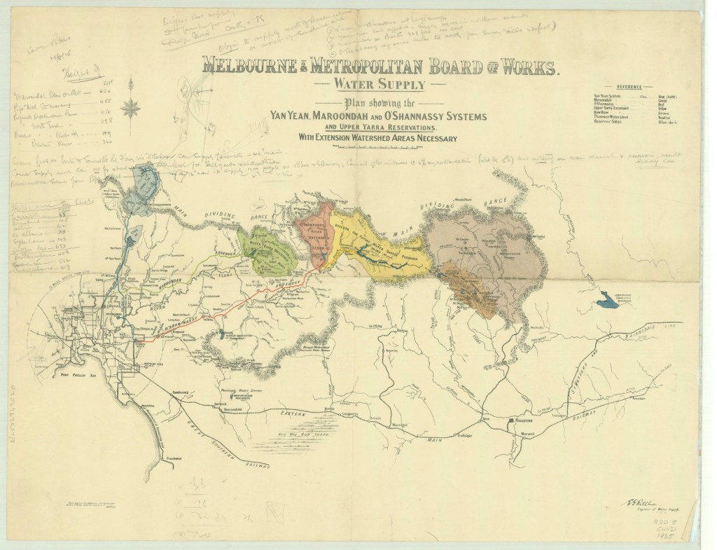 A map produced by the MMBW in 1922 unashamedly shows the Board had their eyes on the entire Upper Yarra catchment together with the Baw Baw, Thomson and Aberfeldy Rivers, which flow into the Gippsland Lakes.