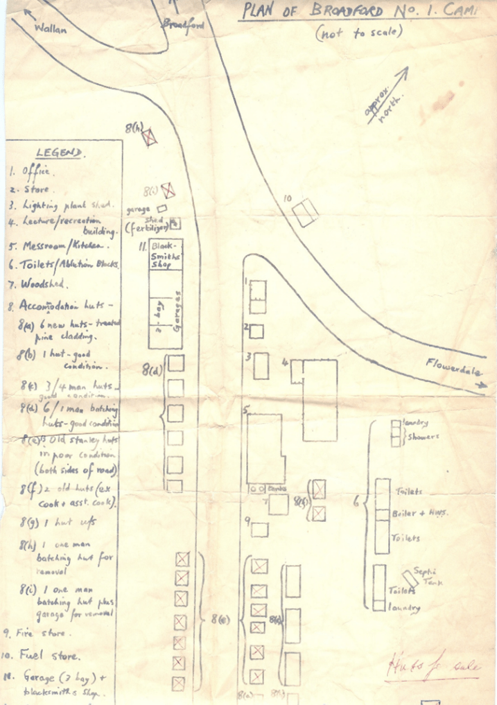 It was reported in the Argus newspaper in July 1949 that Camp No. 1 had all the modern conveniences. Workers lived in army-type huts with electric light, comfortable beds, plenty of blankets, and a mess that turned out three-course dinners under the direction of Chef Frank Chute who had previously served with the 2/8th Bn in the AIF.