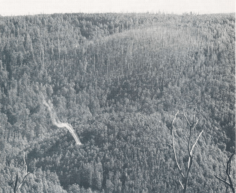The Forests Commission commenced aerial spraying with maldison in the Tarago and Tin Creek areas, south of Powelltown, in the summer of 1964-65.