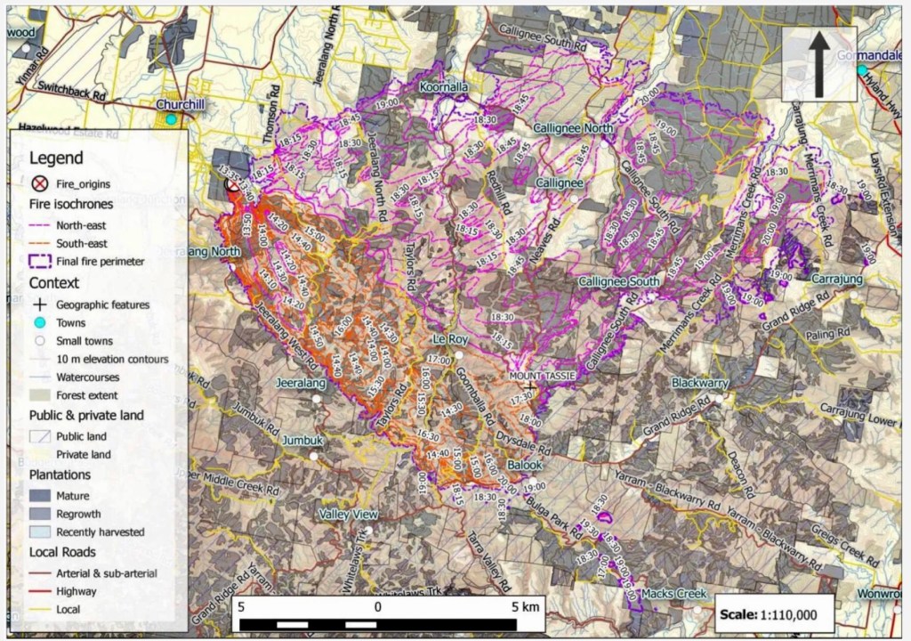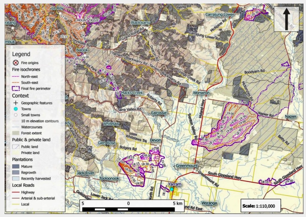 The wind direction changed strongly later in the evening with the SW change, and the fire leaped across small towns in the hills south of Traralgon.