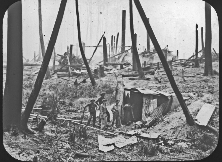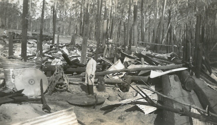 Whereas at the nearby Fitzpatrick’s mill, 16 people burned to death because there was no dugout available. Scrub came right up to the borders of mill. Some men tried to find shelter behind the brickwork of the boiler house, but they were driven out by the flames. Others ran to the sawdust heap, thinking it would protect them from the searing heat, but their bodies were later found where they had tried to burrow into it.