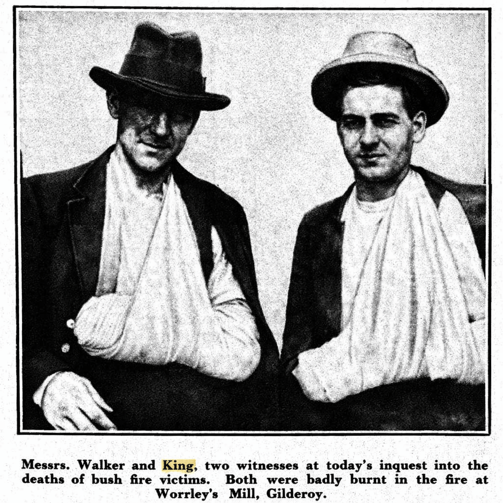 The fire at the mill was closing on three sides and in desperation, Harry King and Arthur (Joe) Walker used their coats to shield their faces and dashed through the fire front. Badly burned and with their hair and eyebrows singed, they managed to reach the same small creek about five or six chains away where they lay for about three hours.