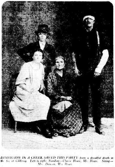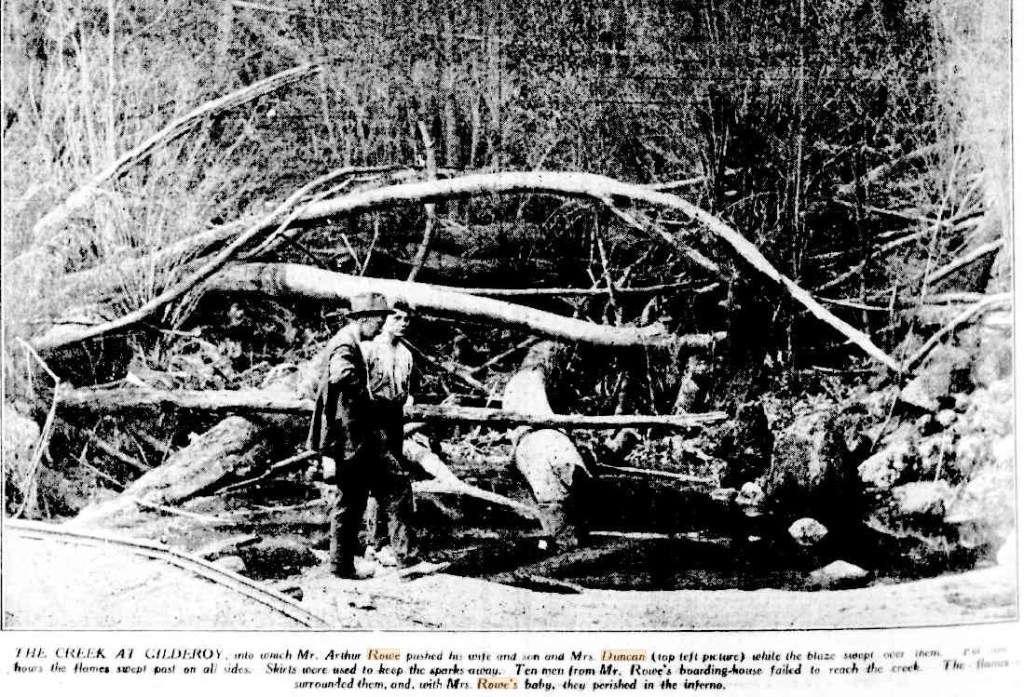 Together with Mrs Elizabeth Duncan, who had only been at the mill for about a week and was helping Mrs Rowe to run the boarding house, the group of four then managed to make their way to a small creek containing about a foot or two of water. Mr Rowe made them lie down and began splashing them with water.