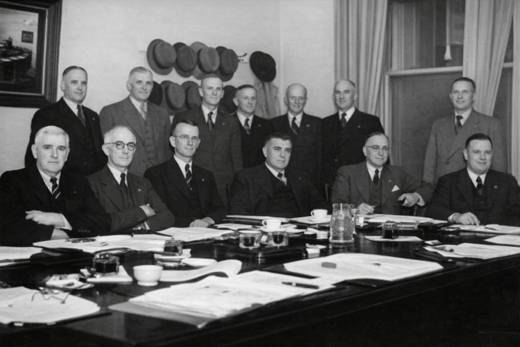 Photo: L-R: Back Row – Geoffrey Graeme Sinclair (Secretary), Angus A. Cameron, E. Buckland, George Stewart, Joseph Firth (FCV), Charles Alfred Daw (Chief Officer – Rural), Alexander McPherson (Chief Officer – Urban). Front Row – T. H. Grigg, W.S. Slater, Herbert Duncan Galbraith (FCV), P. Slouch, W. Charles Moyle, Alexander Mercer King (Chairman). Source: State of Fire.