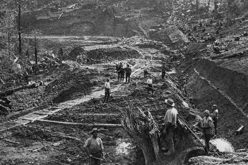 Next to the cement lined channel, a flat access track was constructed from the excavated material with a rail line on top to deliver heavy construction materials like timber, stone, pipes, steel and cement.
