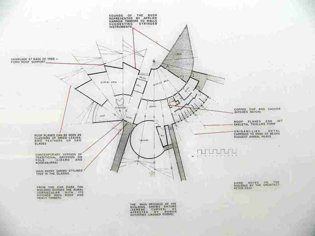 The Toolangi Forest Discovery Centre was designed by Victorian Government architect Peter Pass to match its surroundings using many local timbers. It was deliberately nestled into the messmate bush near the Department of Conservation and Natural Resources (DCNR) offices and the cathedral-like building has a roof shape resembling overlapping gum leaves lying gently on the forest floor.