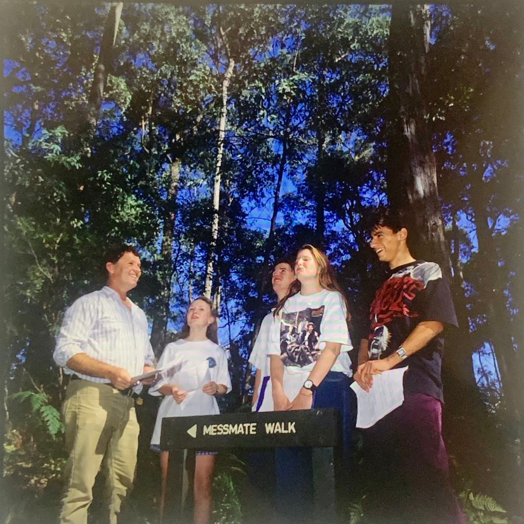 Taken at the VSF in about February 1940. Two students had a significant role in this Forest Faces story. Jack Gillespie (standing third from left) collected photos including Mr Stringy and one of Alfonso Spaghetti, while David Parnaby (sitting third from left) gave us his many humorous doodlings and carvings of the Noorinbee Totems in 1951. Source FCRPA Collection.