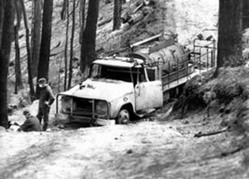 Charlie was with two others in the Olinda tip-truck fitted with a slip-on water tank. The headlights didn’t work so they scrounged some old electrical wire hanging on a fence and cobbled together a makeshift repair. The radio didn’t work either.