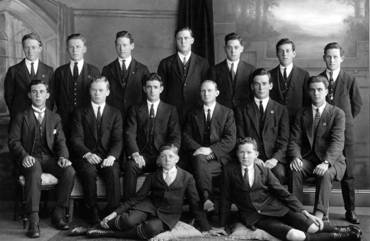 Graduating Class VSF December 1956: Back (l to r) Peter Brown, Bruce Fryer, Ray Baker, Alan Turnbull – Front (l to r) Stephen Berrigan, William Gittins, Frank Moulds (Principal), Brian Woodruff, Brian Gibson