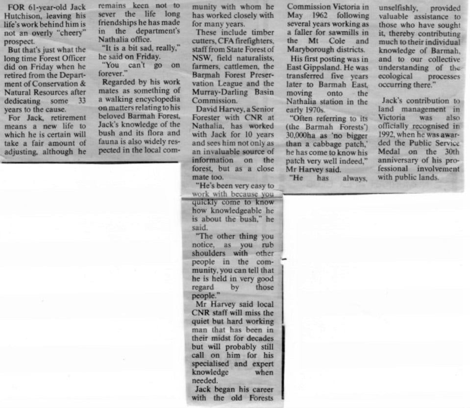 Jack was also awarded the Victorian Public Service Medal (PSM) in January 1992 for his outstanding contribution to forests management at Barmah.