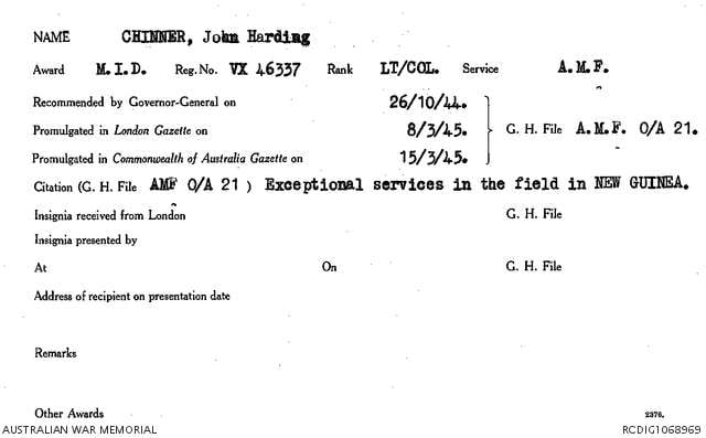 But with the outbreak of war in September 1939 John elected to defer his scholarship and enlisted with the rank of Lieutenant in the AIF in July 1940. He served in the 1st Field Park Company, firstly in the Middle East, and later at New Guinea. He was “Mentioned in Despatches” in October 1944 for exceptional service in the field and rose to the rank of substantive Lieutenant-Colonel. Like so many returned servicemen, he spoke little about his war experiences but always offered assistance to former servicemen in need.