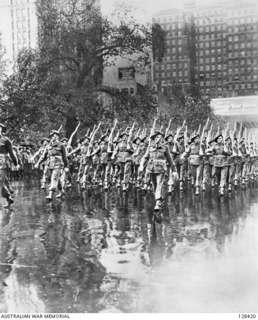Armed Australian Forestry troops marching down Broadway to City Hall Plaza in New York to be welcomed by Mayor La Guardia on 1 October 1943. Said to be the only occasion that armed foreign troops had marched through an American city since Independence. Legend has it that they also sang “Waltzing Matilda”. Source: AWM.