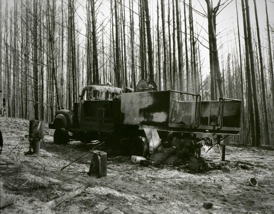 Another party of men narrowly escaped as they drove their truck to safety pursued by roaring flames. The heat was so intense that the clothing of several of the men on the truck caught fire.